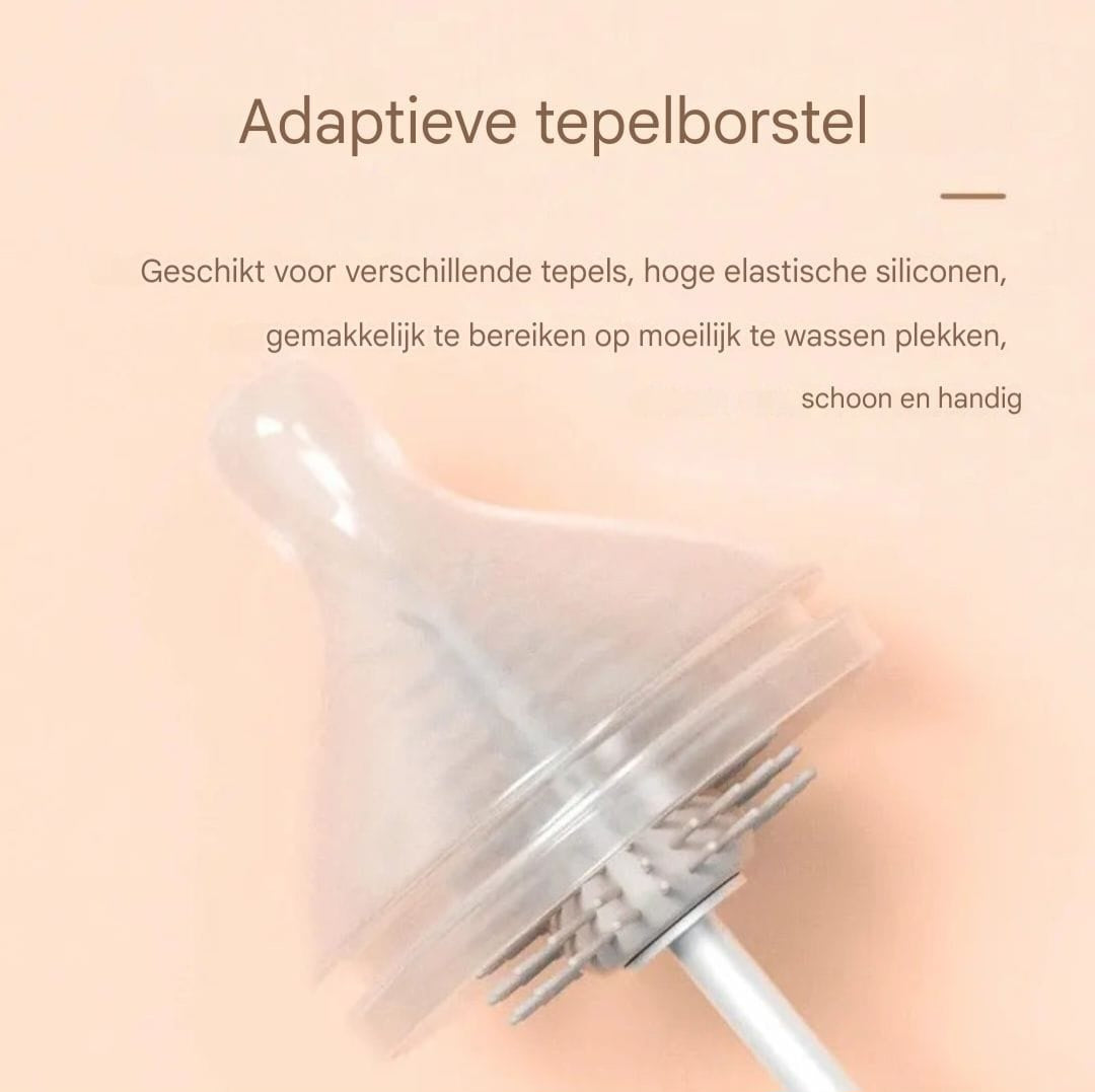 Dieses Bürstenset enthält mehrere Aufsätze, darunter eine flache und eine U-förmige Bürste, ideal zum Reinigen von Flaschen, Strohhalmen und Saugern.