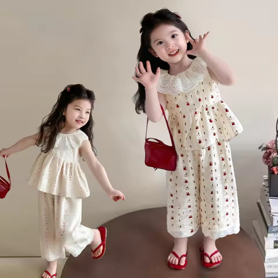 Dieses Mädchen-Set mit Spitzenkragen und Blumenmuster ist perfekt für einen Sommertag. Das fröhliche Blumendesign in Kombination mit dem niedlichen Spitzenkragen macht dieses Outfit sowohl stylisch als auch bequem für Ihre Kleine.